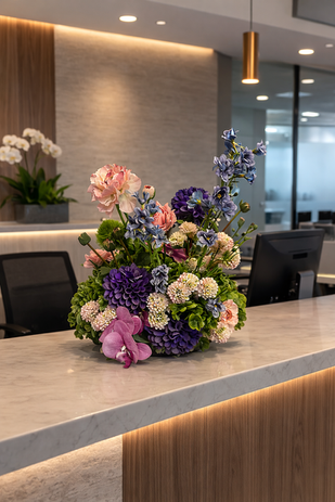 Euphoric No.1 is a joyful composition of soft blush tones, vibrant greens, and sculptural blooms that dance upward with effortless movement. Cascading orchid stems mingle with airy florals and lush botanical textures, creating a design that feels both playful and refined. The layered palette and organic shape evoke the feeling of a garden in full bloom. Fresh, uplifting, and quietly enchanting.
